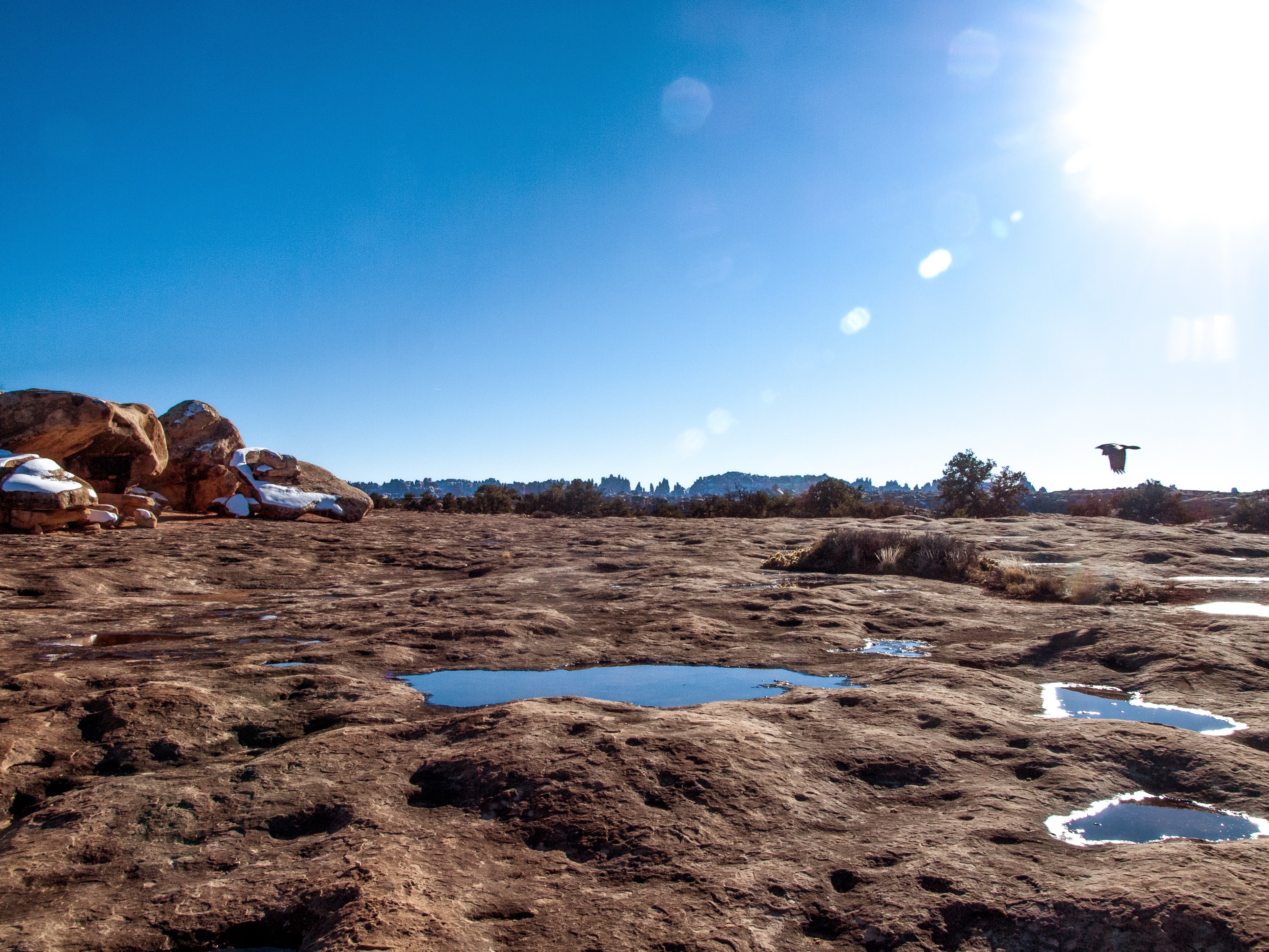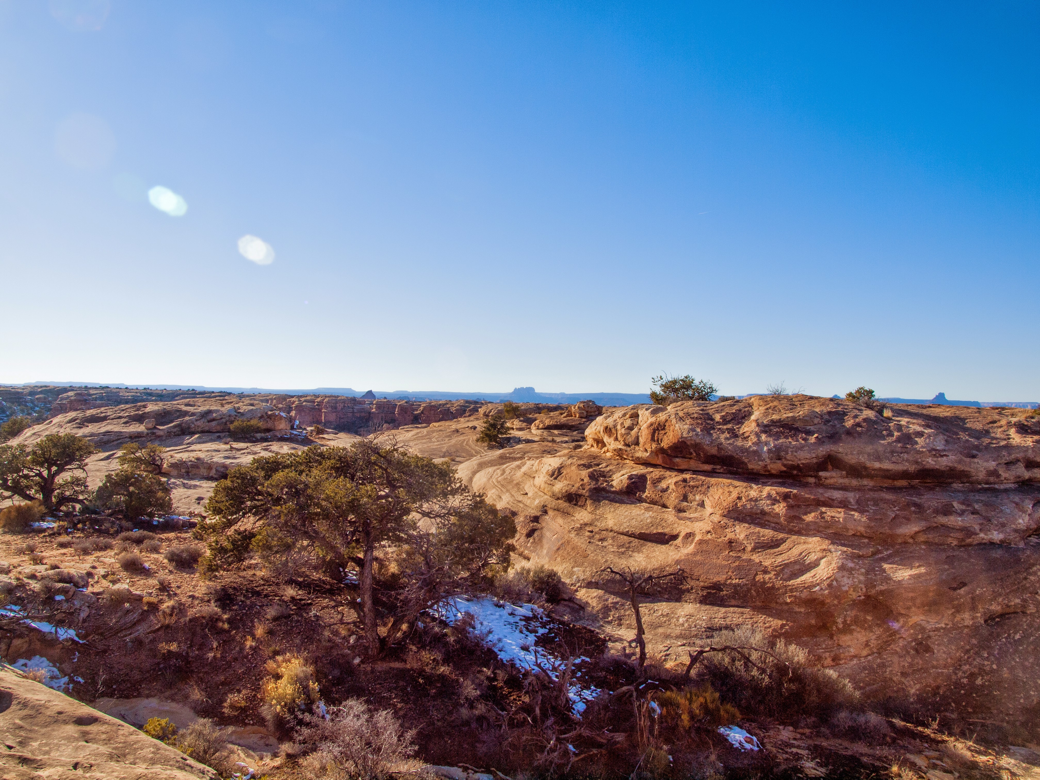 The end of Highway 191. There wasn’t a single soul around. Just big black ravens flapping furiously at me. It happens suddenly, the end. Around the bend and then it stops, civilization, in a glorious culmination of desert. In front rolls out this wild land. The rocks tower high into the blue sky, and the junipers twist around the red sand stone. One step and my world turns into a desert crisscrossed and hacked by canyons and mesas. One step and I could never see another human. One step and I could leave behind this fabricated life.