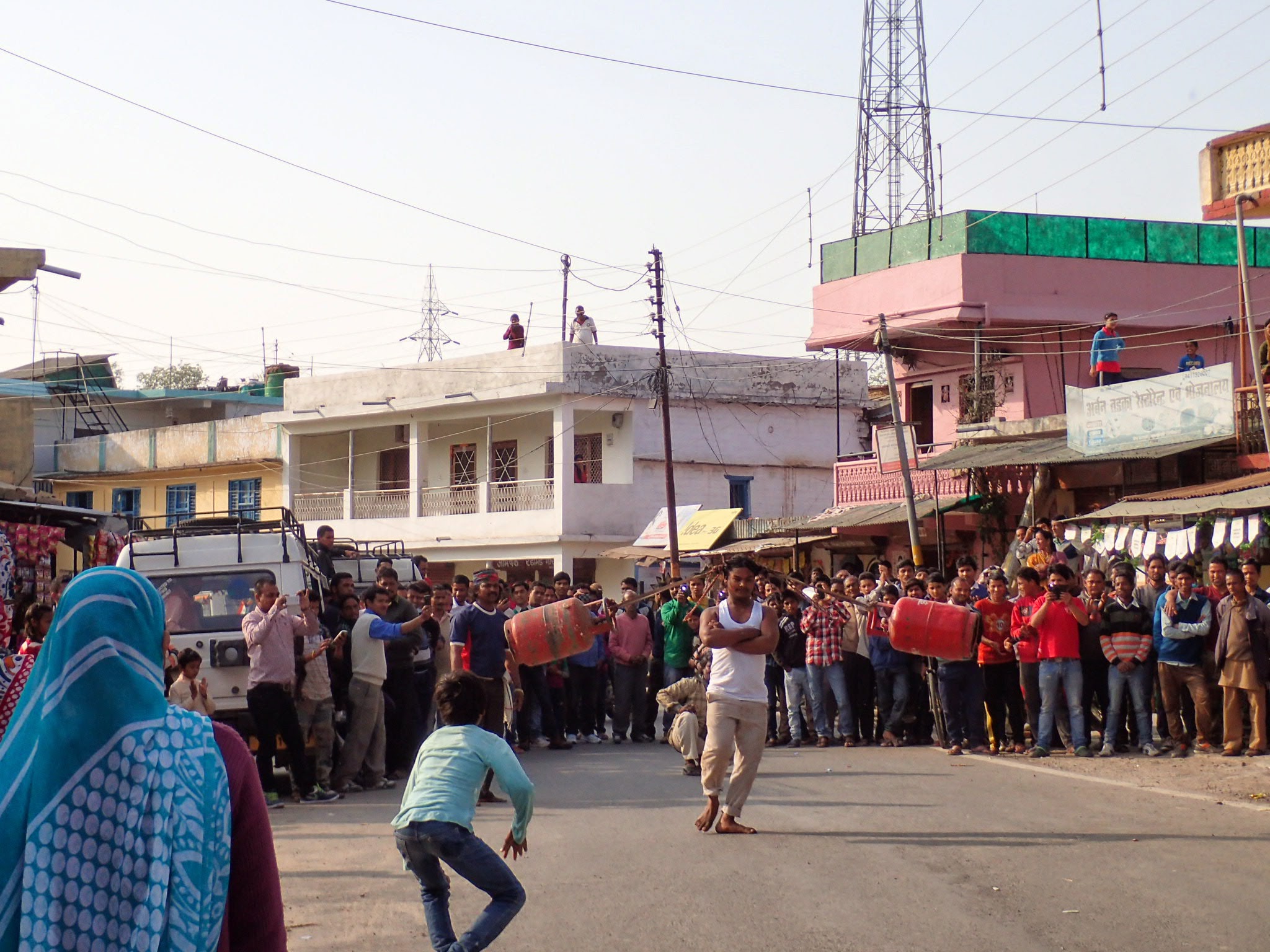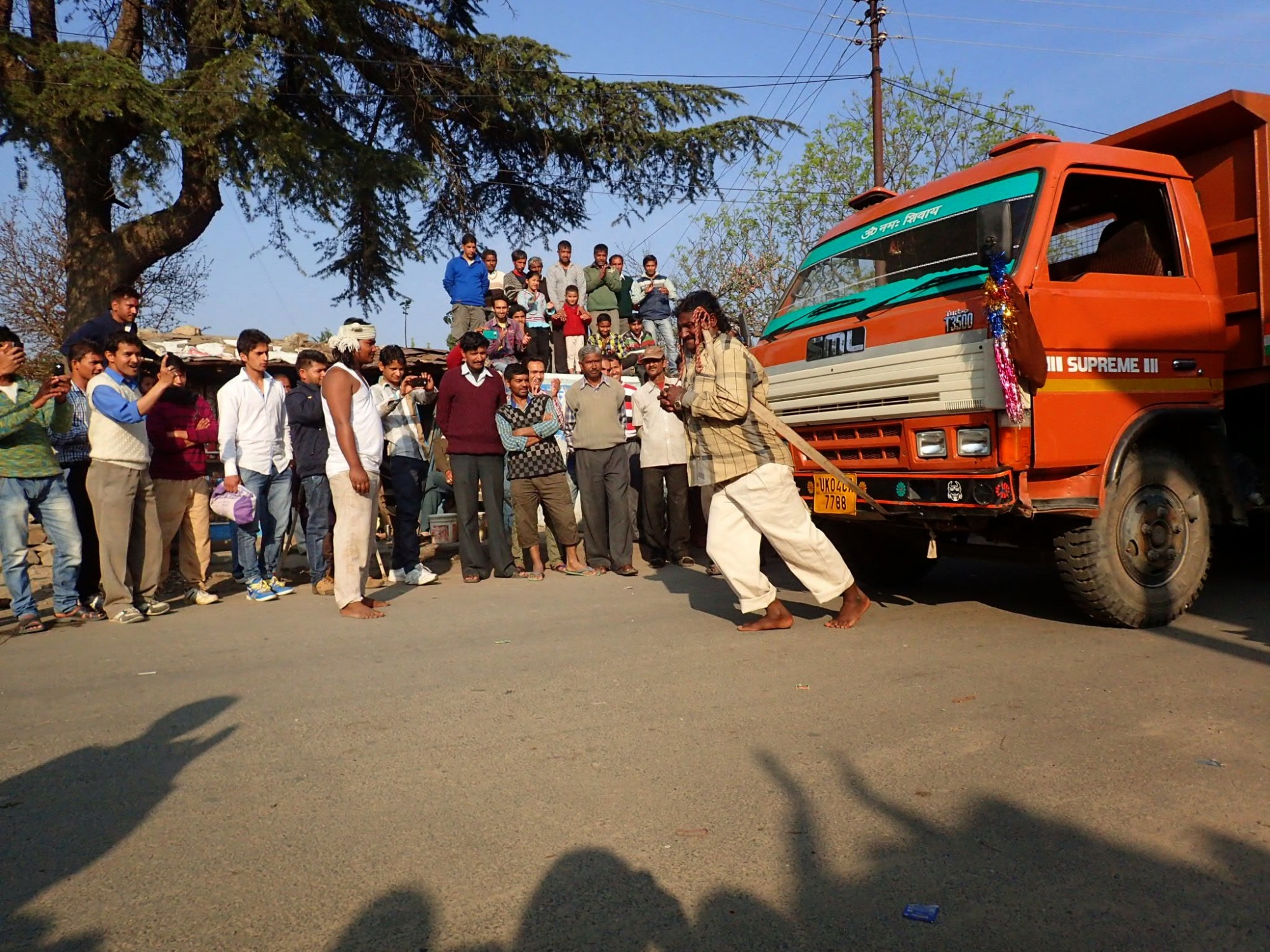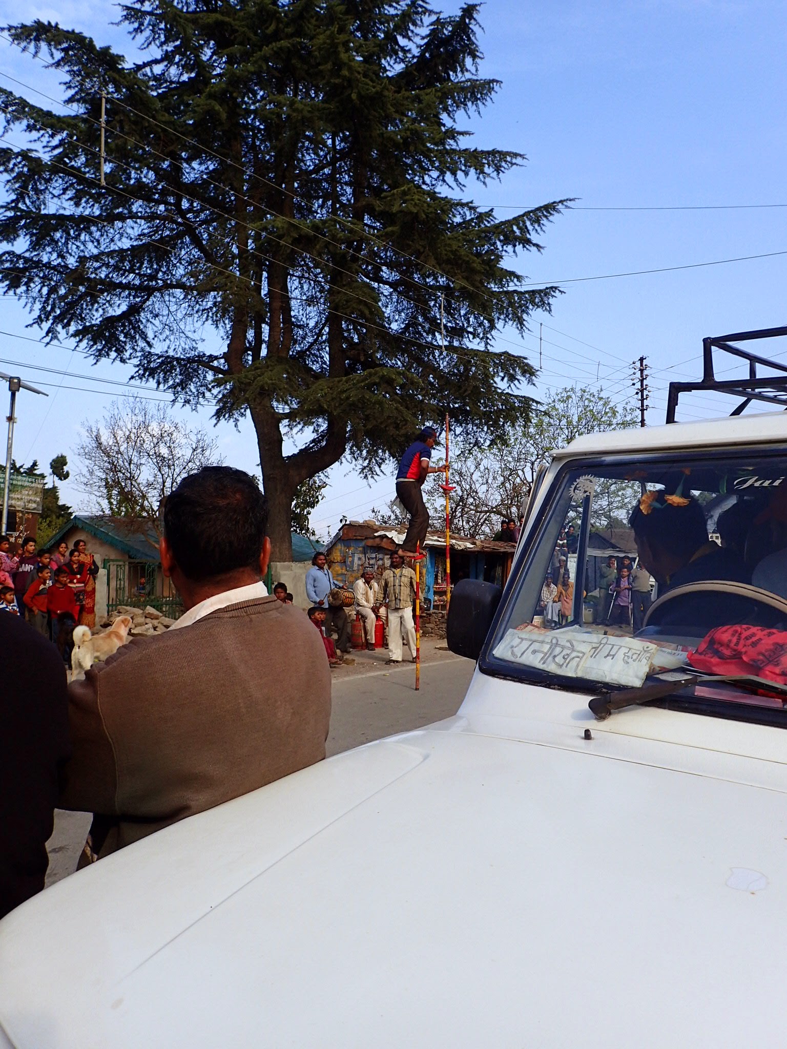 A crowd gathered at the end of the shops. Blocking cars a leathered man walked on stilts taller than two of me. He danced effortlessly around cars and stray dogs. In the middle of the street a ring of villagers surrounded these traveling street performers who with the complexion of Southern Indians stood out exotically among the mountain people. The crowd grew as one of the performers beat at a drum draped around his neck. The villagers watched, hypnotized by the long shaggy hair, wild eyes, and gypsy scarves tied around their heads. They pulled cars with their hair, broke rocks with their arms, threw them with their teeth, and spun gas cans around their heads. I was hypnotized too by the presence these men brought. The children of the band walked around with their protruding bellies shaking cans for the crowds rupees.