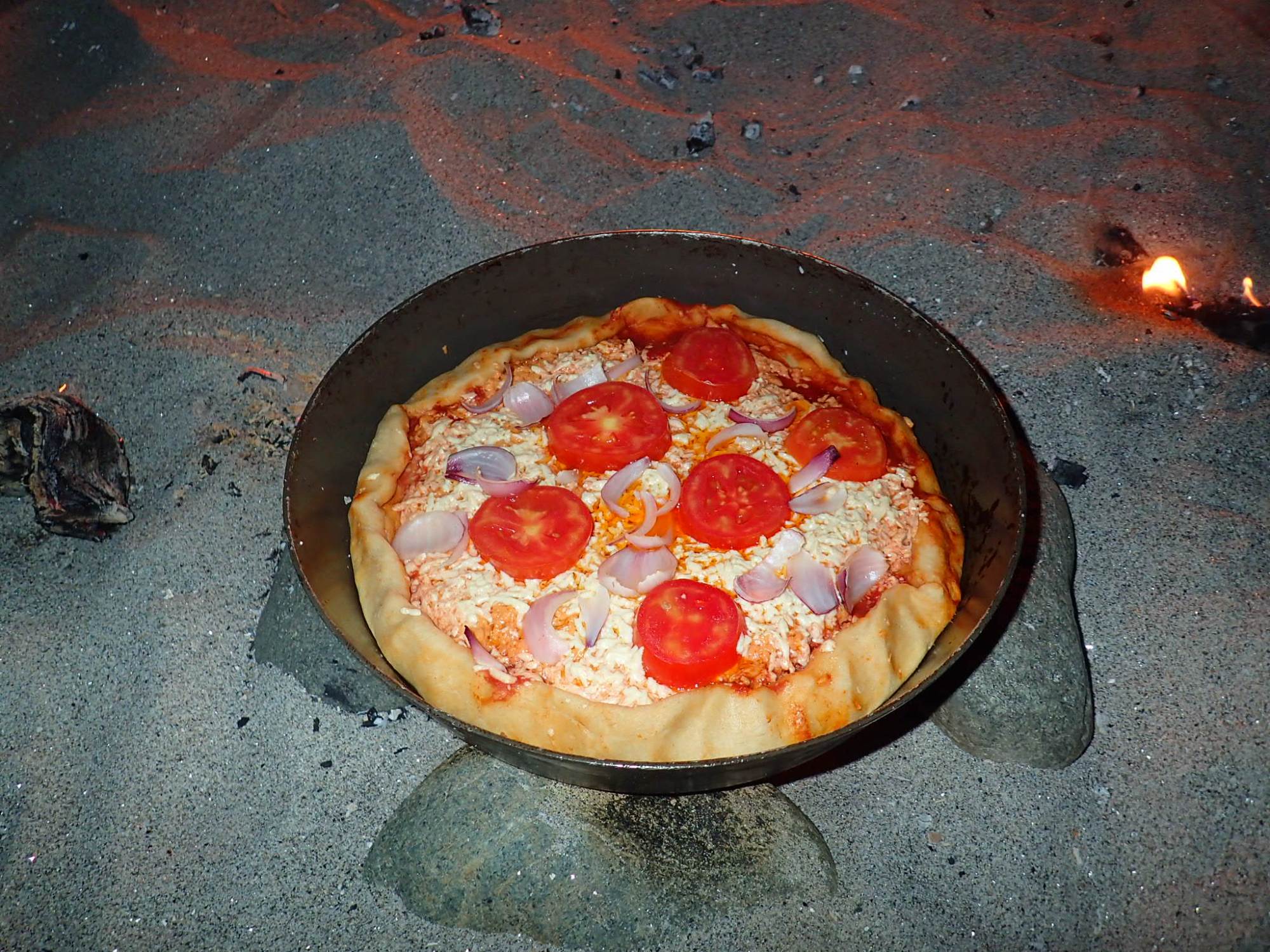 Put the lid on top of the fry pan and stick it on top of the wind screen. The cooking time will vary with altitude and weather, but a good judge is if it starts to turn golden on the top it is almost done and if you smell burning take it off. The stick test always works to – stick a twig into the pizza. If it comes out without dough, the pizza is done!